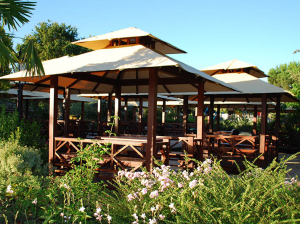 This bungalow, canvas roofed pavilions and decking add to the ambience of this 5 star camping resort.